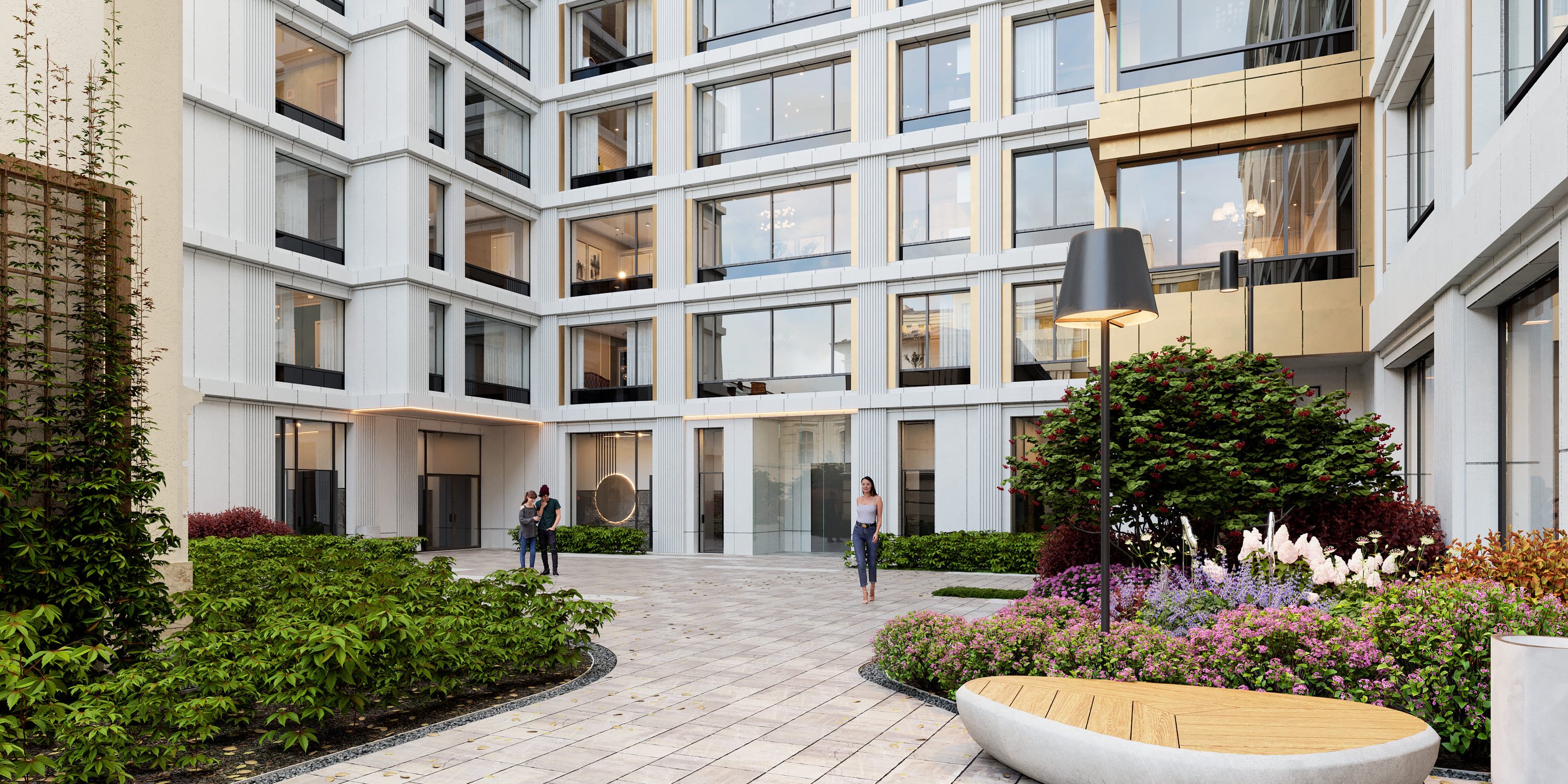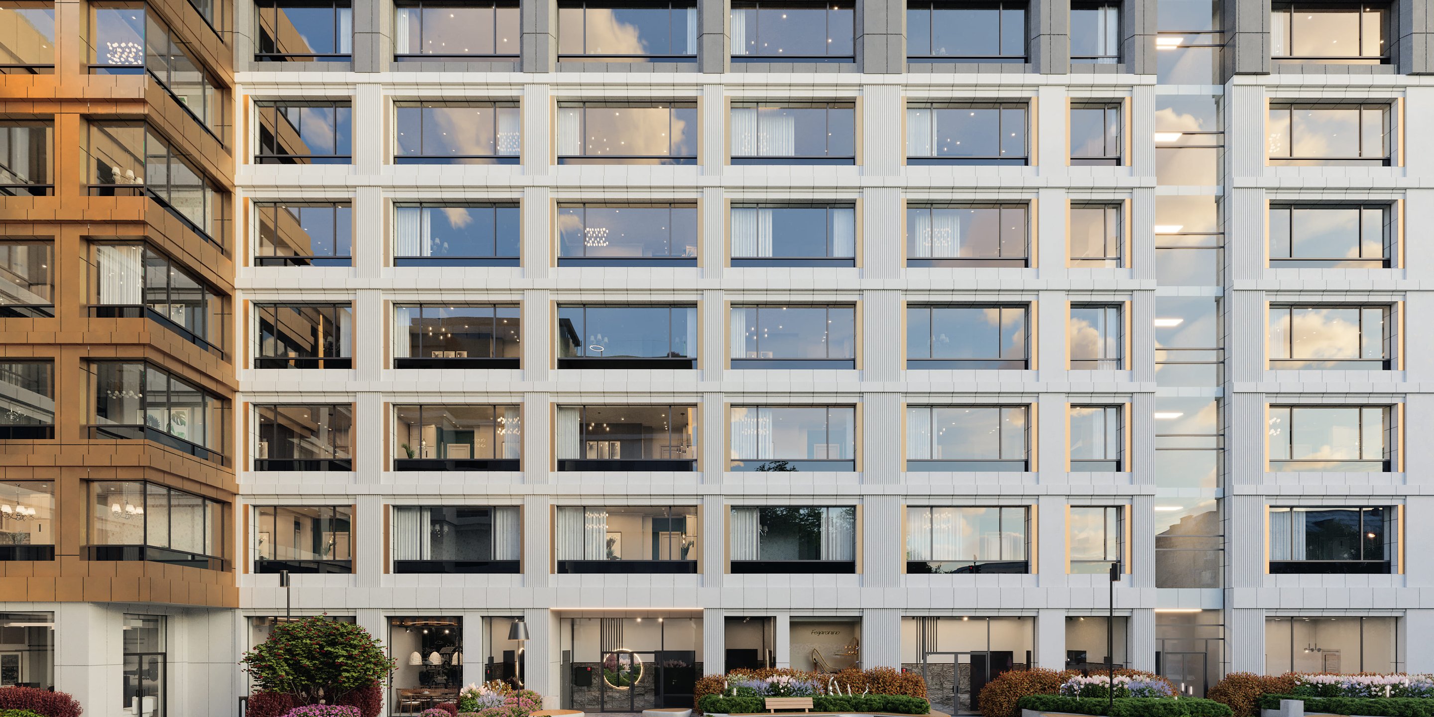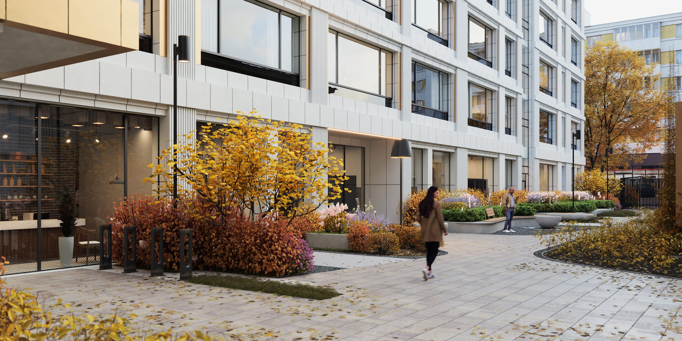 Благородные оттенки идеально сочетаются с витрожным остеклением. Геометрия здания формирует тактильный внутренний двор. Зелёная аллея вдоль квартала с геометричным зонированием усиливает впечатление.