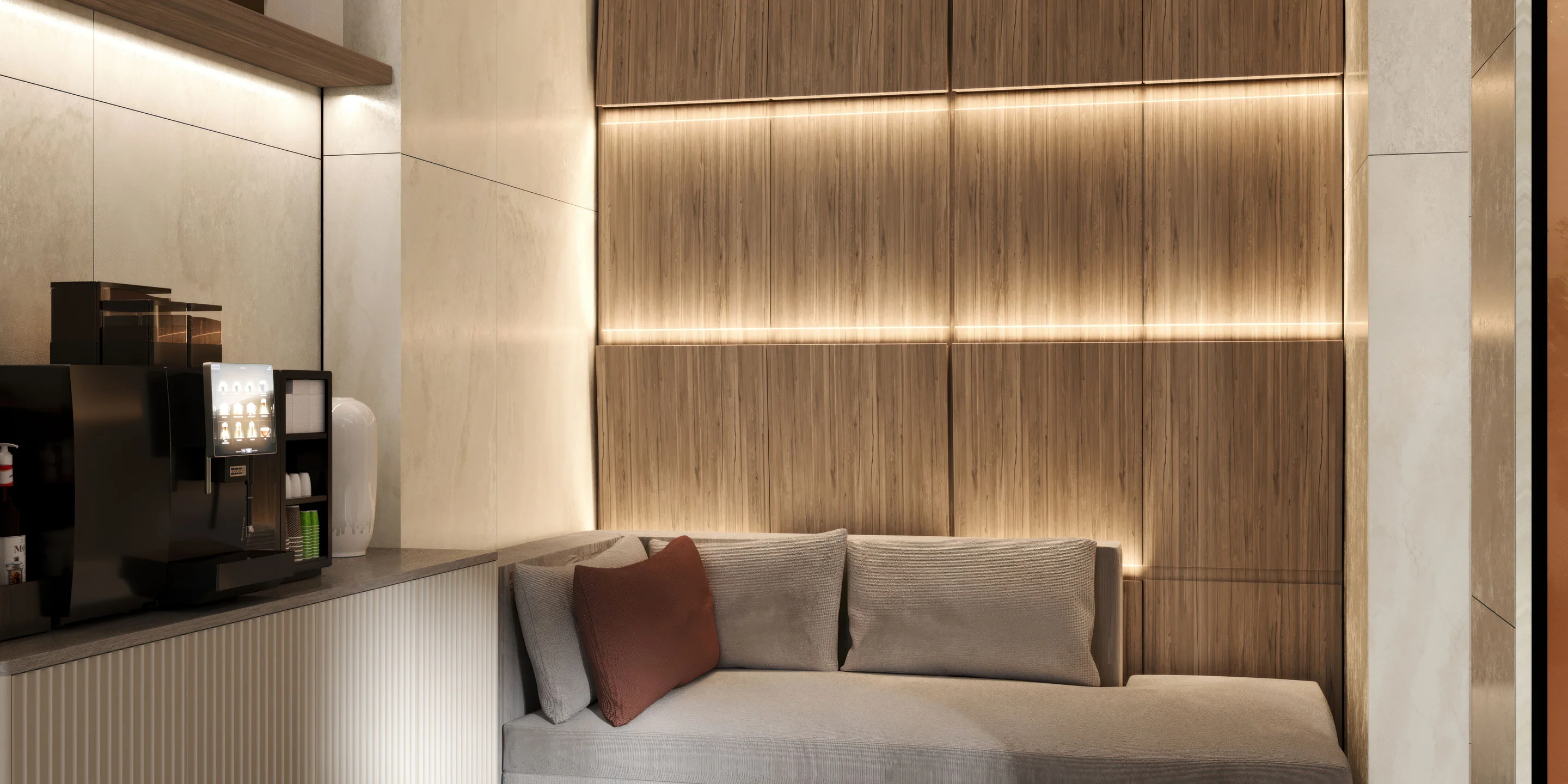 Для ожидания и отдыха – зоны с удобной дизайнерской мягкой мебелью. Отдельно – функциональное рабочее место.
